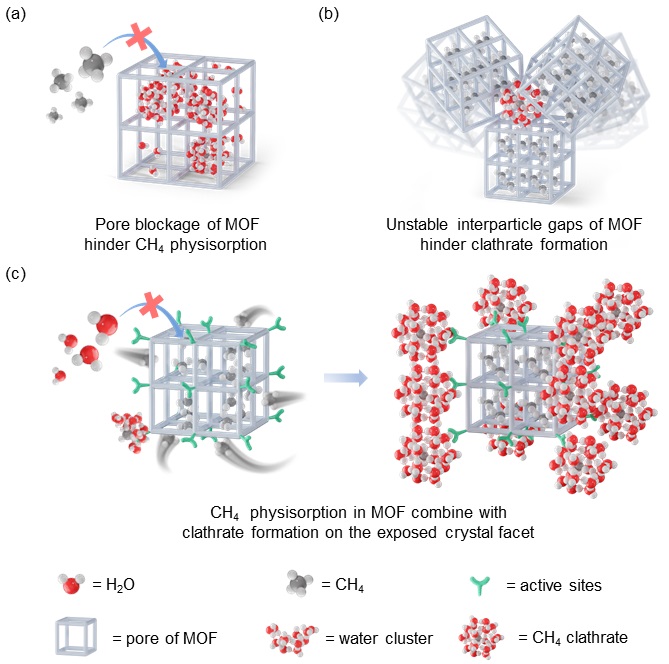 图1.目前MOFs中甲烷水合物形成机制以及本文提出策略的示意图