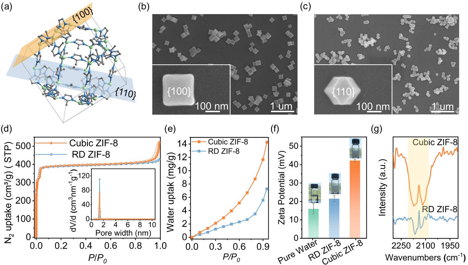 图2.Cubic ZIF-8和RD ZIF-8的示意图与测试
