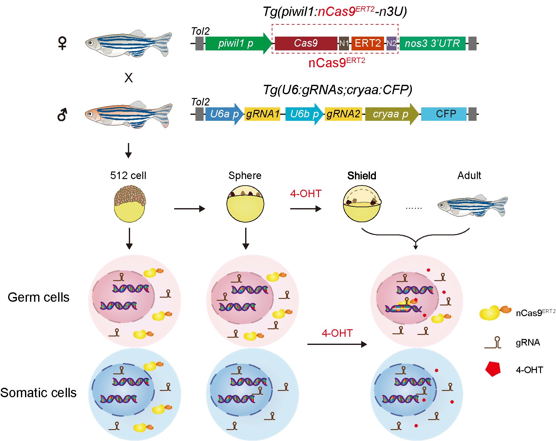 研究团队基于4-羟基他莫昔芬(4-hydroxytamoxifen, 4-OHT)与突变型雌激素受体(estrogenreceptor, ER)构建了4-OHT诱导型Cas9蛋白nCas9ERT2,并在HEK293T细胞系中验证其在4-OHT处理后可诱导nCas9ERT2蛋白入核进行基因编辑。随后,研究人员构建了生殖细胞系特异表达诱导型Cas9蛋白转基因斑马鱼品系Tg(piwil1:nCas9ERT2-n3U)和泛表达gRNA转基因斑马鱼品系Tg(U6:gRNAs,cryaa:CFP)。