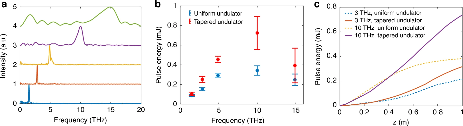 如图2所示,实验在平面波荡器构型下实现了1-20THz全频段百微焦量级的脉冲能量输出,在10THz频点单脉冲能量达到390µJ,进一步采用渐变型波荡器后,单脉冲能量最高达到900µJ,是迄今为止在该频段窄带太赫兹源中获得的国际上最高辐射能量纪录。