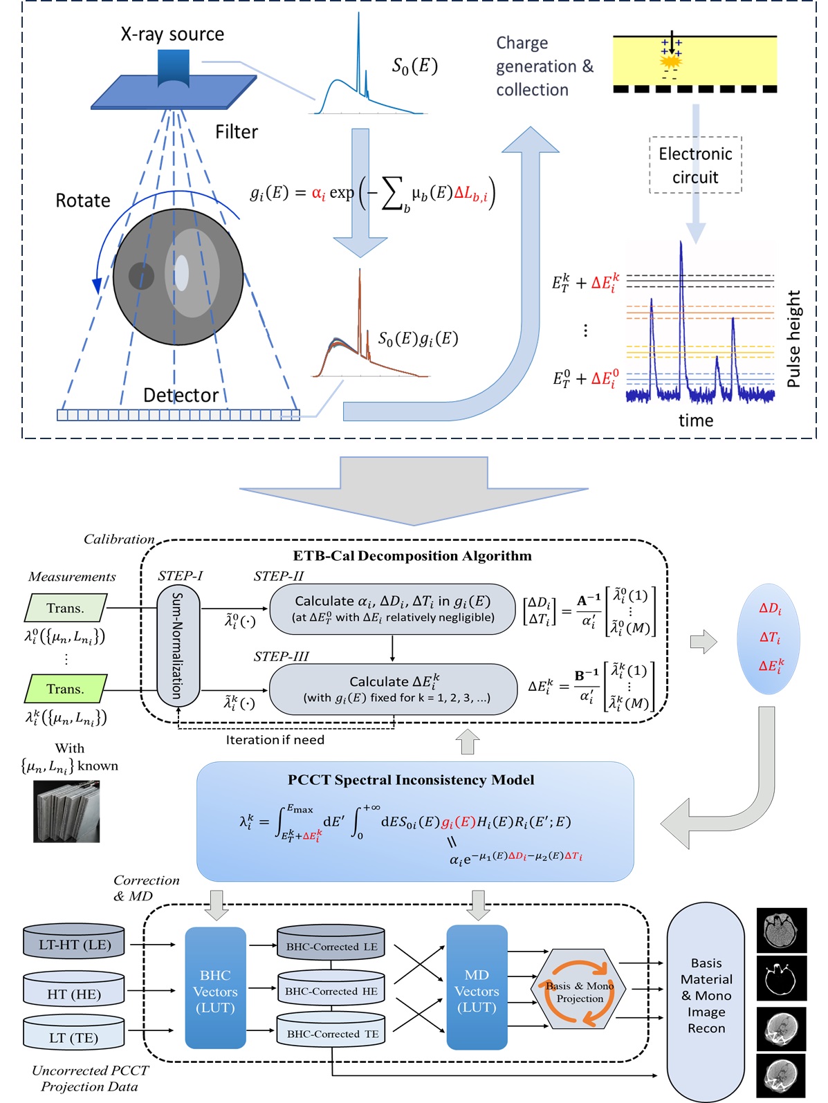 图1.“能量阈值偏差计算器”(ETB-Cal)方法中提出的能谱不一致性模型,ETB-Cal分解算法等的原理示意图