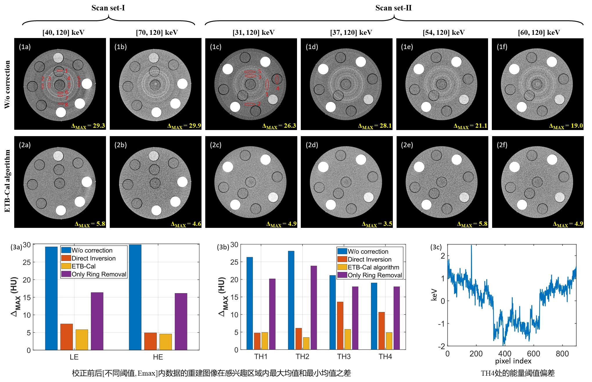 图2.基于“能量阈值偏差计算器”(ETB-Cal)方法的能谱不一致性校正的初步效果展示