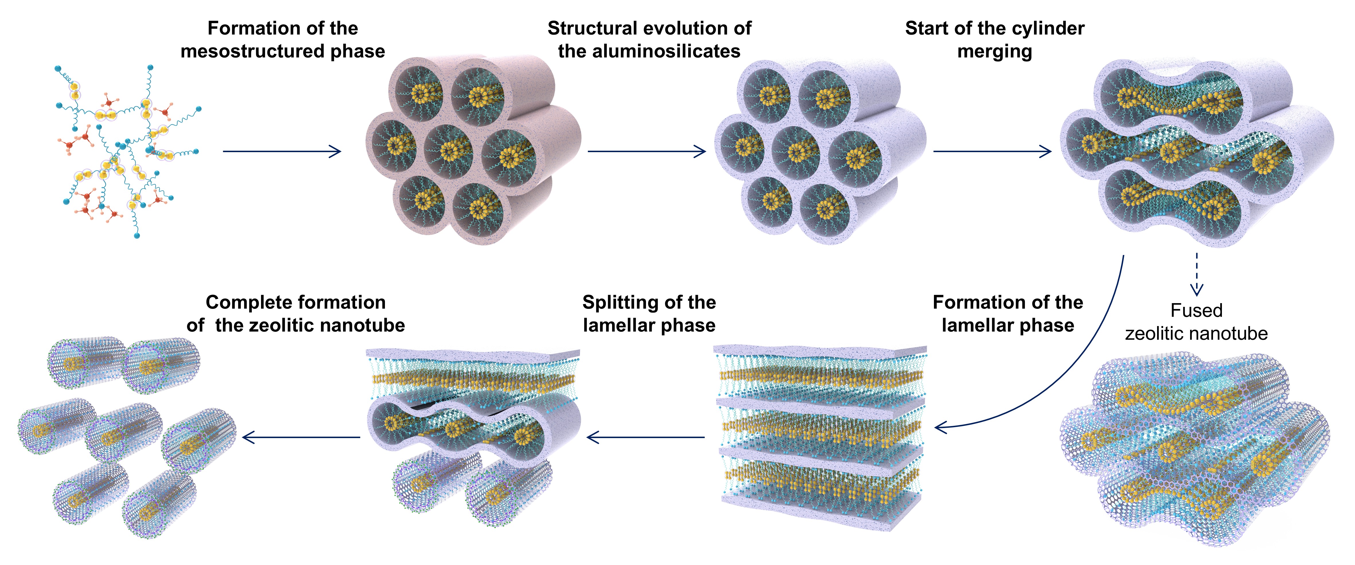 该研究通过时间分辨与多尺度结构表征,明确指出单壁分子筛纳米管并非通过单一步骤直接生成,而是经历由无机短程有序演化所触发的连续结构重构过程:无机骨架片段的电荷密度与有序程度逐步改变了有机-无机组装体的相互作用与界面形态,从而推动介观结构的演变,最终实现了纳米管从层状非稳态相的脱离与闭合。该机制框架将“介观组装”与“分子筛晶化”统一描述,揭示了单壁分子筛纳米管从组装到成形的关键控制逻辑。