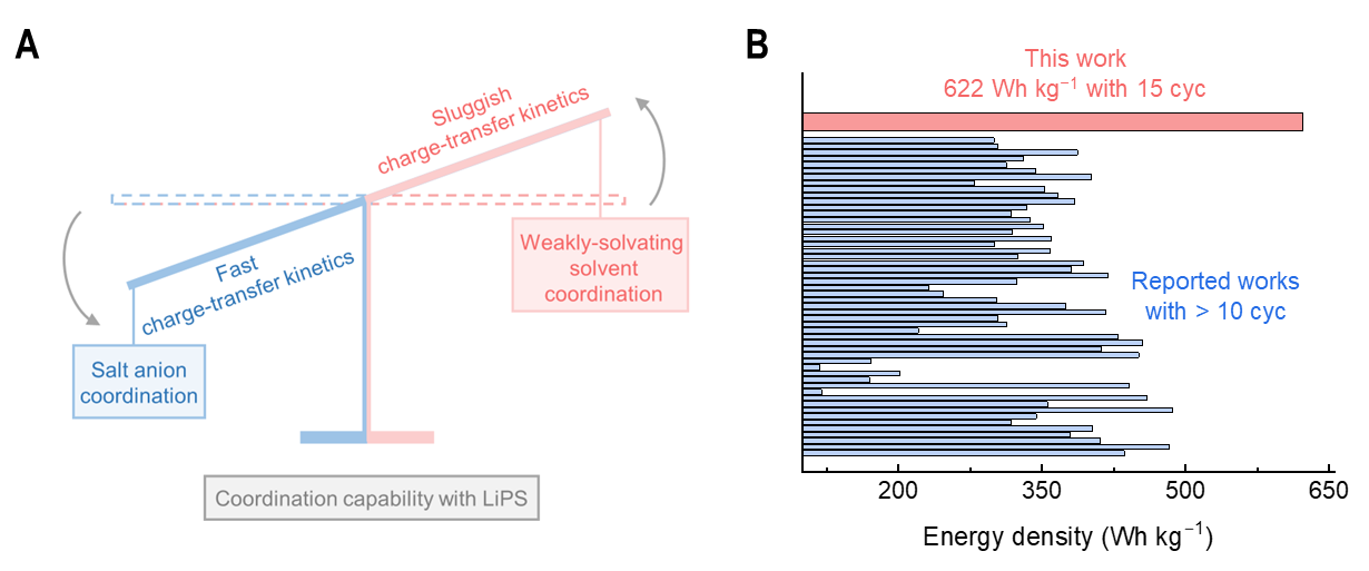 研究团队基于弱溶剂化电解液体系,对强溶剂、弱溶剂、锂盐阴离子和多硫化锂分子之间的相互作用开展系统研究。通过谱学实验和计算模拟指认了锂盐阴离子和弱溶剂对多硫化锂的配位能力相近、在实际电解液中二者存在配位竞争关系。弱溶剂的直接配位会导致多硫化锂的电荷转移能力下降,进而使得电化学极化增大、电池因正极问题快速失效。基于上述理解,研究团队调控锂盐阴离子的配位能力增强,从而减少弱溶剂对多硫化锂的直接配位。经过调制的锂键相互作用提升了多硫化锂的电荷转移反应速率,并进一步实现了实际能量密度高达622 Wh kg-1的锂硫电池器件。该研究解耦了锂硫电池中复杂的溶剂化学机制,指认了阴离子的竞争配位作用与反应调控原理,展示了溶剂化学在高比能锂硫电池中的巨大潜力。
