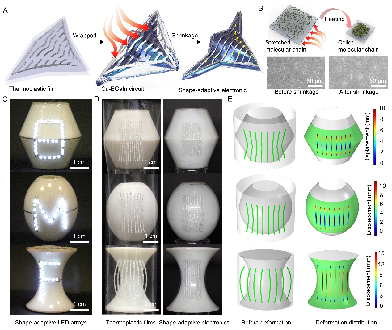 研究成果以“基于热塑性薄膜印刷液态金属电路的自适应三维电子器件”(Shape-adaptive electronics based on liquid metal circuits printed on thermoplastic films)为题,于1月12日发表于《自然·电子学》(Nature Electronics)。