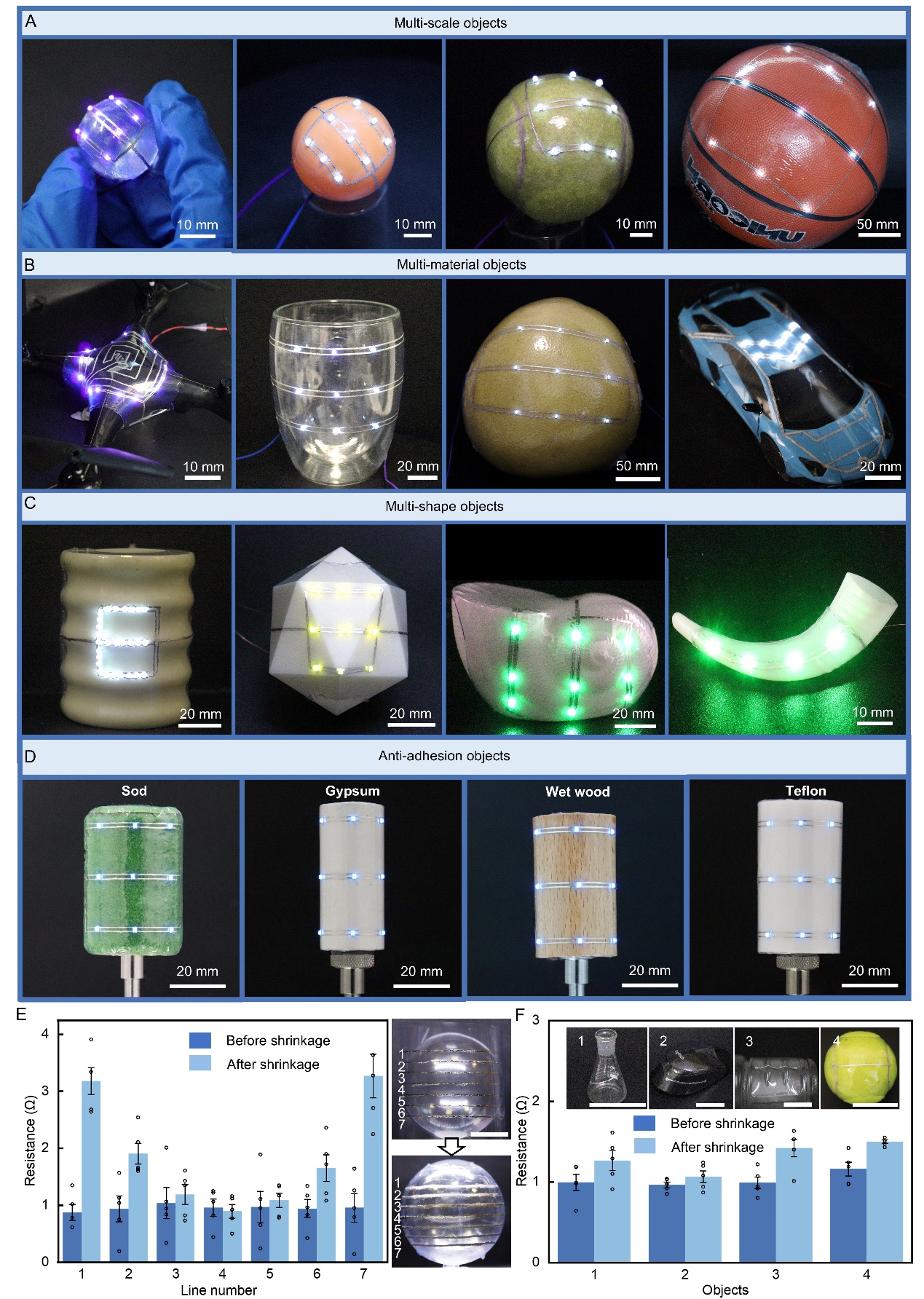 该方法通过收缩的方式将电子器件固定在目标曲面上,对目标曲面的材料与状态耐受性强,研究团队通过多场景测试,展现了该技术在目标物体尺度、材质、表面形态及粘附难度上的普适性(图2)。