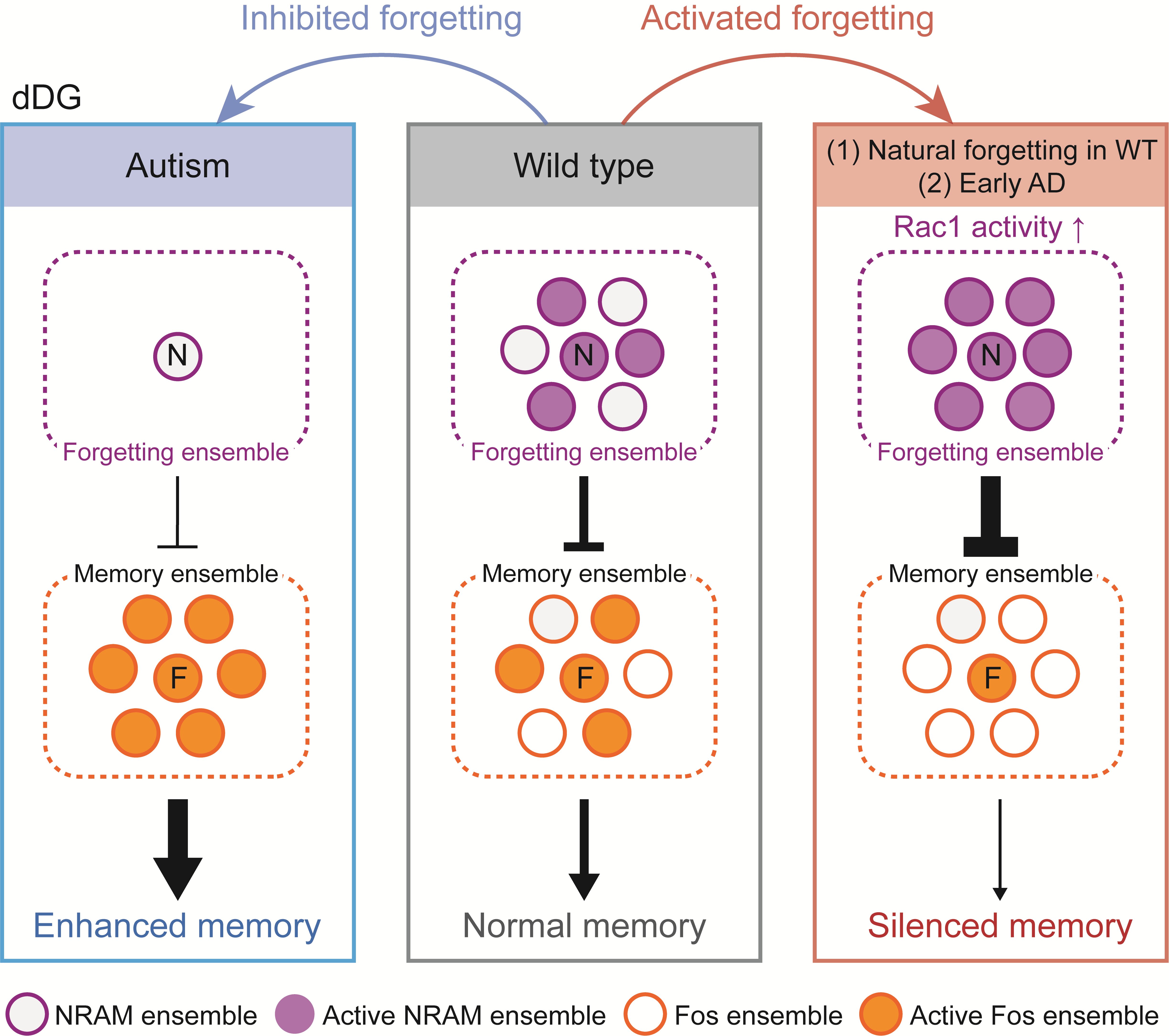 清华新闻网2月6日电 为了拥有灵活的智能,大脑不仅需要“记住”,也需要“遗忘”。长期以来,神经科学领域主要关注记忆是如何被编码和存储的。特定的一群被称作记忆印迹细胞(engram cells,通常以即刻早期基因Fos标记)的神经元群体的重激活,被认为是记忆提取的基础。然而,生物学记忆并非一成不变的机械记录,而是能够根据环境变化灵活调整的动态过程。主动遗忘(Active Forgetting)作为记忆灵活性的一种重要形式,不仅是清除冗余信息的过程,更是大脑进行情绪调节和认知更新的关键。虽然已有研究表明海马体Rac1活性在主动遗忘中扮演关键角色,但一个核心的问题始终悬而未决:在大脑的细胞层面,是否存在一个专门负责“遗忘”的实体印迹?遗忘究竟是记忆印迹的消亡,还是被另一种力量所抑制?