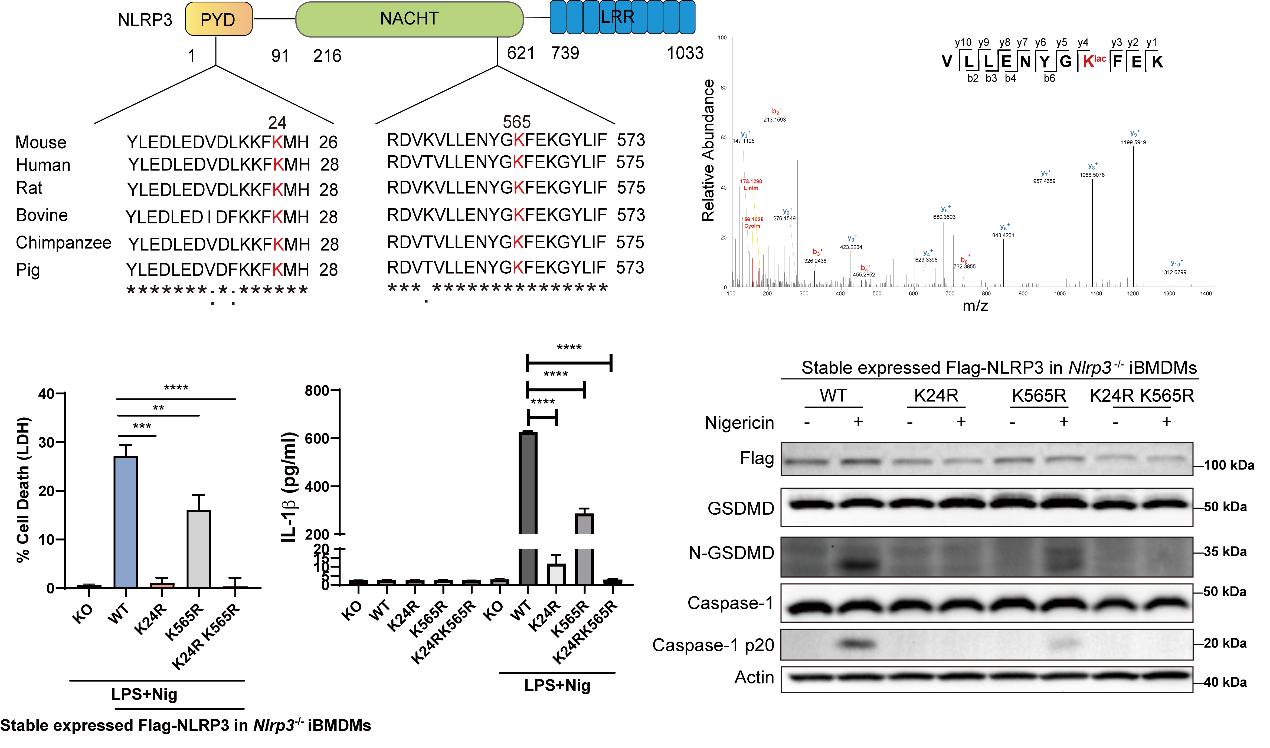 图1.NLRP3乳酸化修饰位点鉴定及功能验证