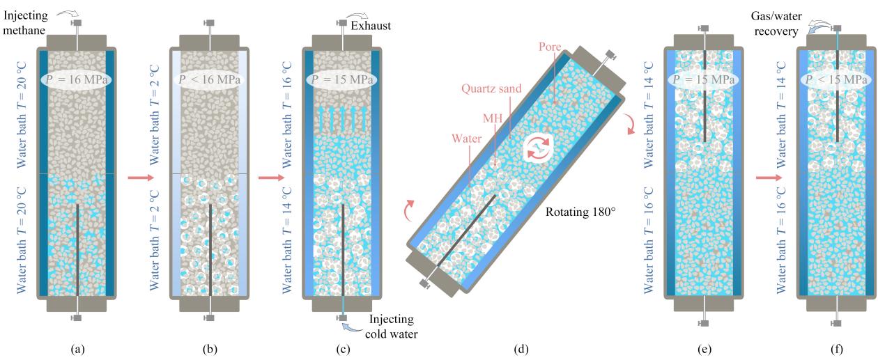 团队通过系统的室内实验与理论分析,取得了一系列突破。首先,团队创新研发了新型实验模拟系统与样品制备方法,突破了储层模拟技术瓶颈。研究团队自主设计了一套带双独立水浴夹套的360°可旋转高压反应釜,配套建立了“水合物合成—旋转—降压开采”的全流程实验方法,攻克了传统实验装置无法同步模拟储层原位地热梯度、水合物层与下伏层间相互作用的行业难题。该装置可精准控制I类储层,使得水合物层温压条件处于相平衡曲线内、游离气层处于相平衡曲线上,完美还原南海原位海洋沉积储层特征。同时,研究团队创新采用了氮气示踪技术,实现了游离气与水合物分解气的实时精准区分,明确了不同气源对产气的贡献占比,为水合物开采领域数值模拟模型提供了关键的实验校准与验证依据。