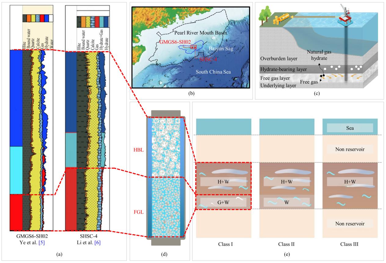 图1.南海天然气水合物储层分布与特征:(a)(b)CMGS6-SH02井与SHSC-4井的区域地质背景、井位及测井结果综合直方图。(c)I类储层开采示意图。(d)反应釜内的I类储层。(e)天然气水合物储层分类(H:水合物;W:水;G:气体)