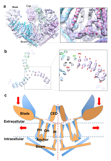 Piezo1结构不仅完美的解释了以往的细胞、生化研究数据,而且还纠正了以往研究中对Piezo蛋白的错误认识。在以往的研究中Piezo1蛋白被认为可能是以同源四聚体形式发挥离子通道功能,而我们的生化及结构证明,Piezo1蛋白主要是形成类似于螺旋桨一样的同源三聚体(图a)。同时,结构分析表明Piezo1蛋白仅含有16个左右的跨膜区,且形成两两配对的阵列结构(图b),这一点与以往生物信息学预测的含有30-40个跨膜区不同。Piezo1蛋白的胞外区由两部分组成,其N端形成一个大的螺旋状胞外区分布在三聚体中心的远端,而在三聚体的正中间有一个球状的“帽子”结构。结构分析表明这一“帽子”结构是由三个CED(C末端胞外区结构域)构成的,而CED由该蛋白的最后一个跨膜区(IH)与只有59个氨基酸的CTD(C末端结构域)相连接。CED-IH-CTD形成三聚体,其正中间为离子透过的通道区域。有趣的是倒数第二个跨膜螺旋(OH)形成了一种功能区替换(domain swap)的结构,其由埋在细胞膜内的四个螺旋形成Anchor结构域与最后一个跨膜螺旋连接,以顺时针的方式分别插入到相邻分子的跨膜区,进而稳定了三聚体的形成(图a)。数据分析表明:Piezo1蛋白位于胞外区的N端螺旋状结构域具有非常高的柔性,其可以左右摆动也可以上下平移,推测其与感受来自不同方向的外界剪切力有关。此外该结构域还由一个具有两个大约80埃长度的在细胞膜内紧贴着跨膜区的Coiled-coil结构(Beam)与CTD相连接,该Coiled-coil结构域可能起到将N端胞外区螺旋结构的形变向胞内区CTD区域传导的功能,进而促进离子通道的开放(图c)。