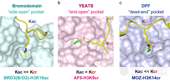 图2:三类组蛋白乙酰化阅读器拥有截然不同的巴豆酰化识别机制。