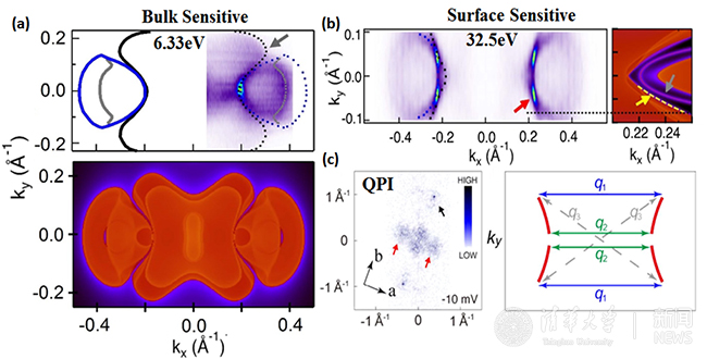 图2: 结合角分辨光电子能谱、扫描隧道显微谱实验测量结果和第一性原理计算得到的拓扑表面态。