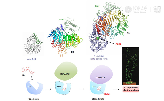 植物分枝是农业生产中的一个重要农艺性状,对于植物株型和作物产量有重要影响;独脚金内酯不仅作为新型植物激素调控植物分枝,还作为根际信号调节“植物与共生真菌”及“植物与寄生杂草”的互作。该最新发表在《自然》上的论文综合采用生物化学、结构生物学、分子遗传学、生物质谱、化学合成等多方面的研究手段,通过对D14、突变蛋白D14(G158E)和突变植物d14-5的生物化学和分子遗传学鉴定,以及对独脚金内酯诱导形成的D14-D3-ASK1复合物的生物质谱、生物化学和晶体结构的分析,发现受体D14蛋白水解各种不同结构式的独脚金内酯分子,生成同一来源于独角金内酯D-环的活性分子CLIM、将CLIM完全包裹在其催化中心并以共价键方式不可逆地结合CLIM、招募F-box蛋白D3、触发激素信号传导链;该研究还发现,受体D14蛋白在生成激素活性分子、感知活性分子和招募F-box蛋白的过程中发生了巨大的构象变化,揭示了D14-D3的精细互作面及其在独脚金内酯信号通路中不可或缺的作用,并在植物体内鉴定了与受体D14通过共价键结合的独脚金内酯活性分子CLIM。