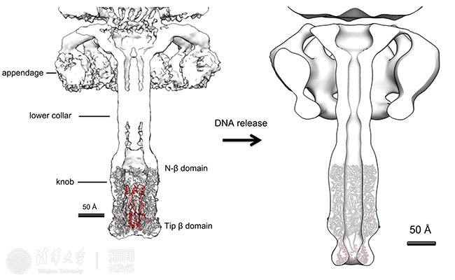 细菌病毒(又名噬菌体)φ29属于双链DNA病毒,其通过自身的非收缩性短尾特异性侵染宿主枯草芽孢杆菌(Bacillus subtilis)。属于革兰氏阳性菌的枯草芽孢杆菌由细胞壁和细胞质膜包裹,帮助自身抵御外界干扰及病毒入侵。噬菌体首先需要克服细胞壁和细胞膜的阻碍,才能将遗传物质注入宿主进行复制和重新组装。φ29及其它大多数噬菌体通过尾部蛋白肽聚糖水解酶对细胞壁进行局部水解而突破细胞壁。然而,科学界对于噬菌体突破细菌细胞质膜并释放其遗传物质到宿主体内的机制知之甚少。