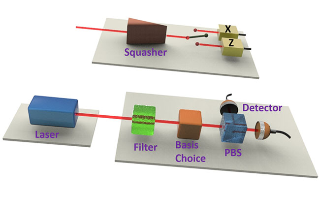 图:源无关量子随机数发生器示意图。整个随机数发生器主要包含激光源和探测设备两部分。其中探测设备由滤波器,基矢选择器,偏振分束器及探测器组成。即使在激光源不能被刻画的情况下,基于这套设备也可以以每秒5 kbit的速度提供具有高可靠性的量子随机数。