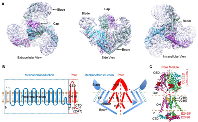 通过与91精品国产自产在线老师啪-国产一级农村无码-中文字幕无码人妻AAA片-人妻不敢呻吟被中出A片视频-好看的亚洲av日韩av在线播放高宁研究组及杨茂君研究组合作,他所带领的课题组在国际上率先解析重组表达的鼠源全长Piezo蛋白的亚纳米级别分辨率冷冻电镜三维结构。Piezo1同源三聚体整体呈现类似于三叶螺旋桨的架构,远端胞外区呈现扇叶结构,最后一个胞外区正好位于结构中心且呈现帽子样结构,每一个螺旋桨骨架由至少14个明显的跨膜区组成,每个骨架下面还含有一个长的“横梁”支撑上面的跨膜区(图A)。这一整体特殊新颖的结构也暗示了Piezo蛋白家族可能通过胞外的扇叶区去感受机械力进而调控中心成孔区的开放关闭状态。该研究成果于2015年9月21日以长文形式发表在《自然》(Ge et al., Nature 2015)。