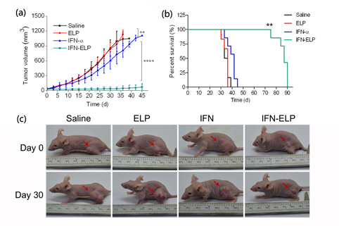 高卫平研究组创造性地通过基因工程技术将ELP与IFN-a融合,使用大肠杆菌、制备出IFN-ELP融合蛋白,产率高,成本低,并且较好地保持了IFN-a的生物活性(41%)。IFN-ELP的半衰期是IFN-a的28倍,在肿瘤中的浓度高达IFN-a的66倍。小鼠肿瘤模型上的药效测试表明,IFN-ELP几乎完全抑制了肿瘤的生长,而IFN-a仅能轻微地抑制肿瘤的生长(图2a,2c)。IFN-a对照组中小鼠的中值存活率仅为42天,但是IFN-ELP治疗组中小鼠的中值存活率明显延长至87天(图2b)。这些研究结果初步表明,ELPfusion有望替代PEGylation和Albufusion等现有方法成为提高蛋白质药代和药效的新方法,通过该方法可以研发出更多更好的创新生物药物用于癌症、肝炎等重大疾病的治疗。