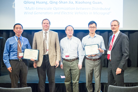 该论文提出了不确定风能接入下的电动汽车多时间尺度充电控制优化方法,通过灵活调度电动汽车的充电时间,提高电网对风能的消纳程度。贾庆山副教授代表三位作者领取了获奖证书。
