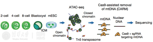 开放染色质定位技术(ATAC-seq)和线粒体DNA去除技术(CARM)用于研究早期胚胎的开放染色质区域。