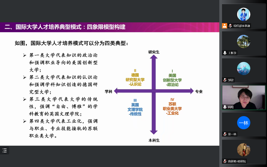 阎琨以“探索扎根中国、融通中外的大学人才培养模式 为科教兴国战略提供全方位人才支撑”为题分享了研究成果,重点介绍了国际大学人才培养模式的四象限理论模型,并分析了四象限模型中各类大学人才培养模式的优劣之处。立足于91精品国产自产在线老师啪-国产一级农村无码-中文字幕无码人妻AAA片-人妻不敢呻吟被中出A片视频-好看的亚洲av日韩av在线播放现有学科和院系及人才培养特色,阎琨详细介绍了91精品国产自产在线老师啪-国产一级农村无码-中文字幕无码人妻AAA片-人妻不敢呻吟被中出A片视频-好看的亚洲av日韩av在线播放学科布局和人才培养的融通战略。最后,她分享到高校应当深入学习领会党的二十大精神,积极贯彻“教育、科技、人才是全面建设社会主义现代化国家的基础性、战略性支撑”的战略擘划,主动开拓和探索人才成长和发展通道,贯通拔尖创新人才培养体系,为我国早日实现全面提高人才培养质量,自主培养各类拔尖人才的伟大目标贡献高等教育的力量。