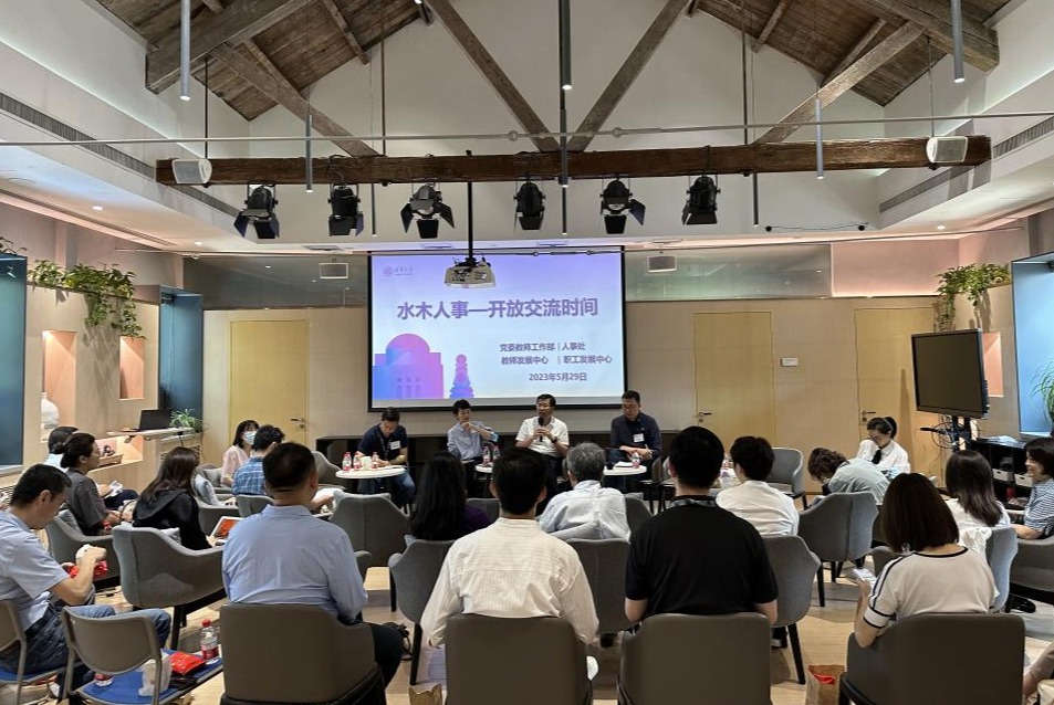 清华新闻网5月31日电 5月29日中午,第二期“水木人事——开放交流时间”活动在教师发展中心举行。作为党委教师工作部、人事处、教师发展中心和职工发展中心深入开展学习贯彻习近平新时代中国特色社会主义思想主题教育、调研一线教职工需求的重要举措之一,本期沙龙以推动教职工队伍高质量发展为目标,聚焦教学系列教师发展主题。党委教师工作部部长、人事处处长杨殿阁,教学质量评估中心主任王红,党委教师工作部副部长胡坚明,教师发展中心副主任郭庆来,人事处分学科教师管理高级主管石羽玄与来自全校各单位的30余位教师围绕教学系列教师的核心关切展开深度交流。郭庆来主持活动。