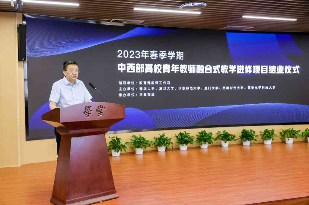 任友群代表教育部教师工作司对本次培训的圆满举办,对学有所获的全体学员表示祝贺,向参与项目的六所高校和相关专家的辛苦付出表示感谢。任友群表示,2023春季学期中西部高校青年教师融合式教学进修项目开放了87门精品课程。两个学期以来,累计近万名中西部青年教师通过六所高校的克隆班,参与原汁原味的授课场景;通过资深教师的“传帮带”,萃取高水平的教学经验。项目正以大规模在线教学的经验、行之有效的教育数字化实践,推动教师间共享共建共学,让青年教师们学有所获、教有所成,真正成为教育数字化的参与者、建设者和受益者。