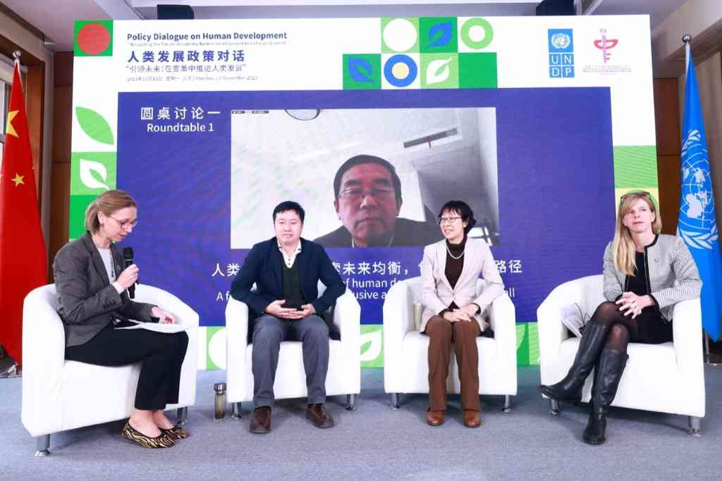 主旨演讲后举行了两场圆桌讨论。第一场讨论由联合国开发计划署驻华代表处政策与研究处主任阚薇澜(Violantedi Canossa)主持,主题为“探索未来均衡,包容增长的路径”。浙江大学共享与发展研究院院长李实、国务院发展研究中心公共管理与人力资源研究所研究室主任冯文猛、中国人口与发展研究中心国际部部长汤梦君、联合国妇女署中国办公室国际项目官员布里安娜·斯图尔特(Brianne Stuart)围绕相关议题展开讨论。