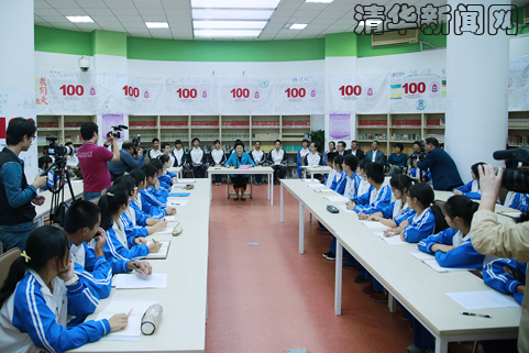 下午3时,刘延东来到清华附中,与老教师代表座谈。刘延东与老教师一一握手,亲切交谈,关切地询问他们的身体和生活情况。刘延东说,在母校百年华诞来临之际,与老校长、老教师见面,我感到非常亲切,看到大家身体很健康,精神饱满,我感到非常高兴。我曾在清华附中度过三年难忘的学习生活时光,这是我人生成长的重要阶段。尽管我们见面很少,但我时时刻刻都想念着大家,经常回忆起万邦儒校长和在座老师对我们悉心的教诲。她说,百年来,清华附中一直秉持着“自强不息、厚德载物”的校训,以“爱国奉献、追求卓越”作为优良传统,弘扬“立德树人、行胜于言”的师德师风,在历任校长和教师的共同努力下,始终坚持把培养德智体美全面发展的人才作为学校的宗旨。特别是改革开放30多年来,不断创新教育教学方法,深化教育改革,在基础教育改革领域发挥了很好的示范作用,取得了很大的成绩,培养了一批各领域的优秀人才,为国家现代化建设和改革开放作出了贡献。