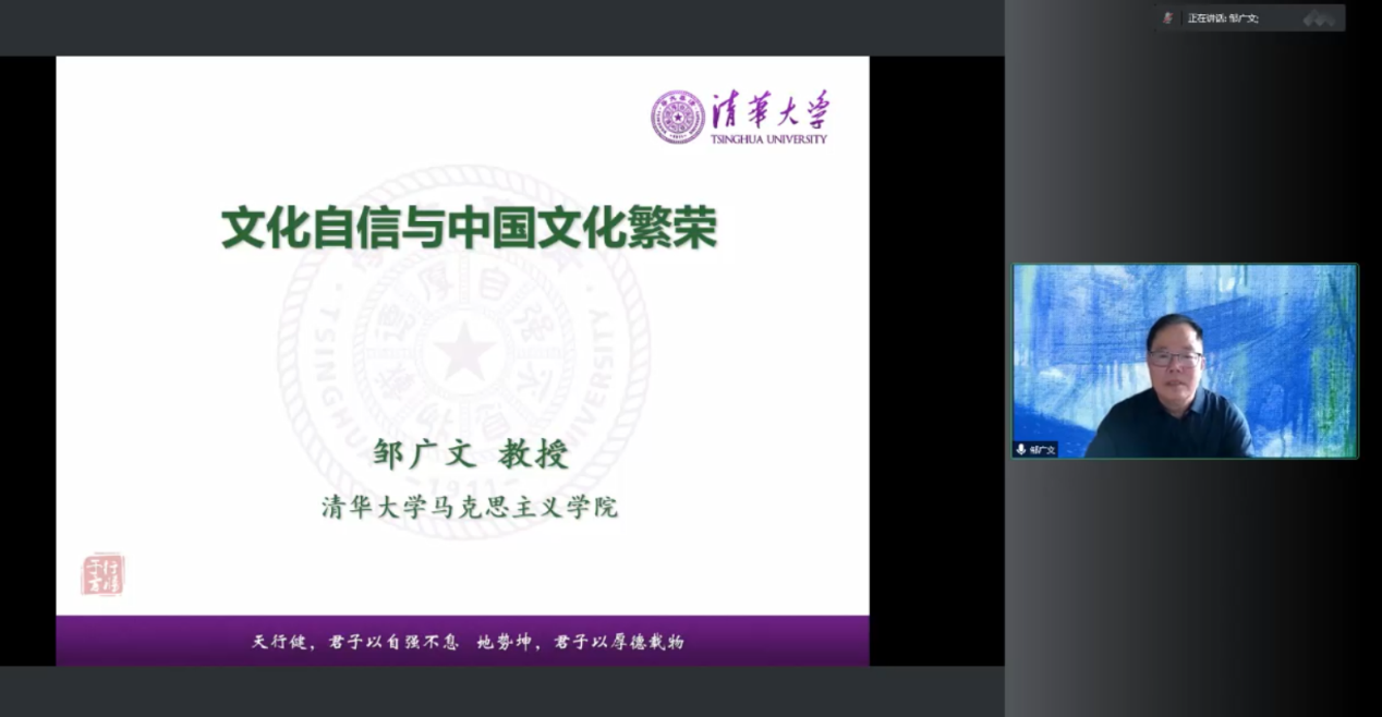 讲座围绕“文化自信为何如此重要”和“推进中国文化繁荣兴盛”两个问题展开。邹广文首先从学理层面厘清了文化的概念,认为文化就是人与自然相区别;接着指出,文化自信是一个民族、一个国家以及一个政党对自身文化价值的充分肯定和积极践行,并对其文化的生命力持有的坚定信心。文化自信主要有三重内涵:对民族文化传统的自信、对现实实践道路的自信和对未来发展前景的自信。文化自信的重要意义在于,它是更基本、更深层、更持久的力量,没有高度的文化自信,没有文化的繁荣兴盛,就没有中华民族伟大复兴。