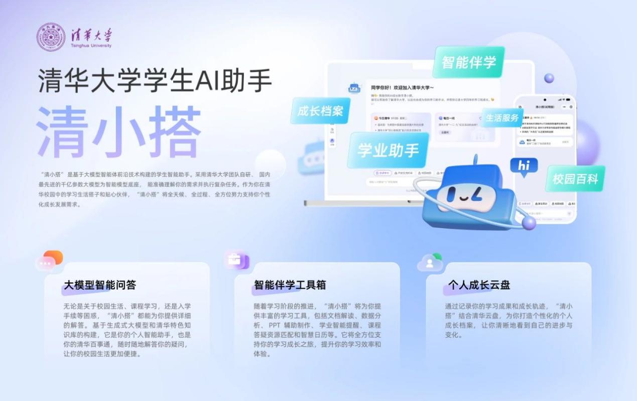2024年2月,学校提出为每一位2024级新生配备“AI成长助手”,作为学生学习与发展指导中心主任,刘知远带领团队主动承担了“AI成长助手”的研发任务,并用3个月时间完成了方案设计和技术开发,于2024年8月14日上线试用。