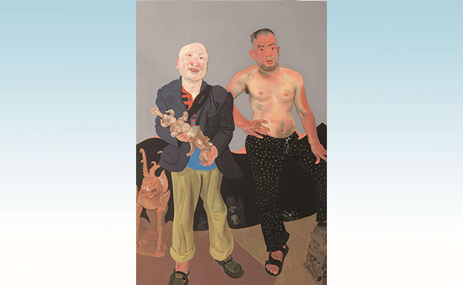 回首他作品的前前后后,你会感到他生命后期的绘画,已从凡界步入东方绘画的神界,实相生在了空相中。作品《古玩》是最好的例证。画中赤脸人和白脸人,东旺一见就惊喜,两个人满身洪荒气,如浪亦如电,一下把他撞击到黄土清泉泥土陶俑的世界中。他的直觉与想象迫不及待地走进了中国文化意象造型的语境,笔意、力势、线型、神韵,均以气行色,浑然书写而成。恍惚天工之妙,令人兴奋。