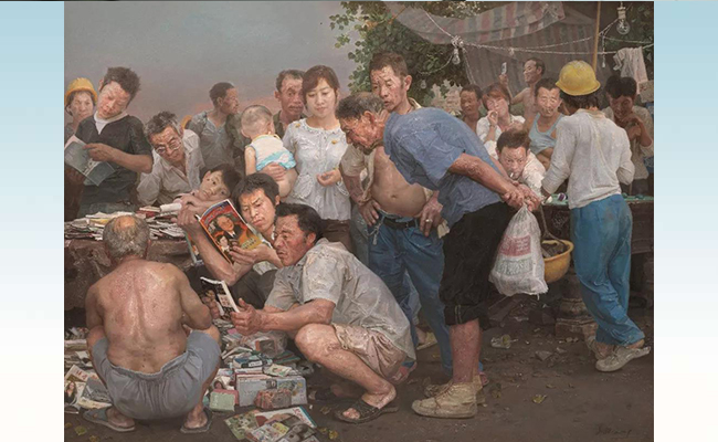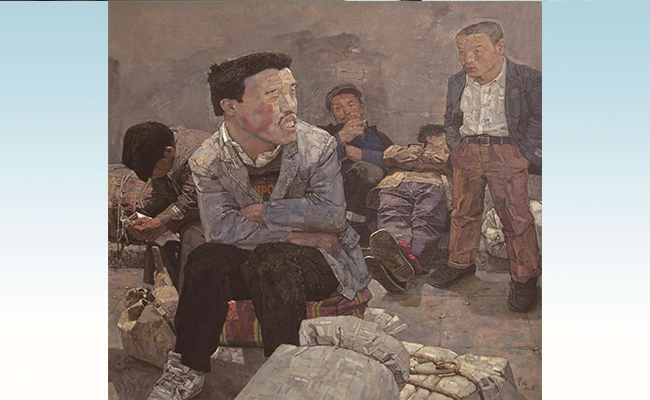 看到东旺的初期油画,是在“第三届中国油画年展”和“首届中国油画学会展”上展出的《明天多云转晴》和《诚城》,一出手就自成一家。画中一群进城的农民工,站的站,躺的躺,坐的坐,望的望,他们都在等待,等待工作?等待希望?等待命运?东旺说:“前途未卜”。此情景东旺感同身受,早年他作为乡间小画匠,东寻西找,顶风冒雨,走街串巷,也曾等待,等待多云转晴,等待长大成人,等待机遇降临,等待艺术梦的理想成真……