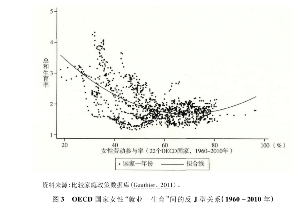 “所谓‘反J型’,即发展趋势的曲线就像英文字母J的镜像图形——随着女性劳动参与率的提高,总和生育率先下降,然后略微上升。”蒙克解释说。