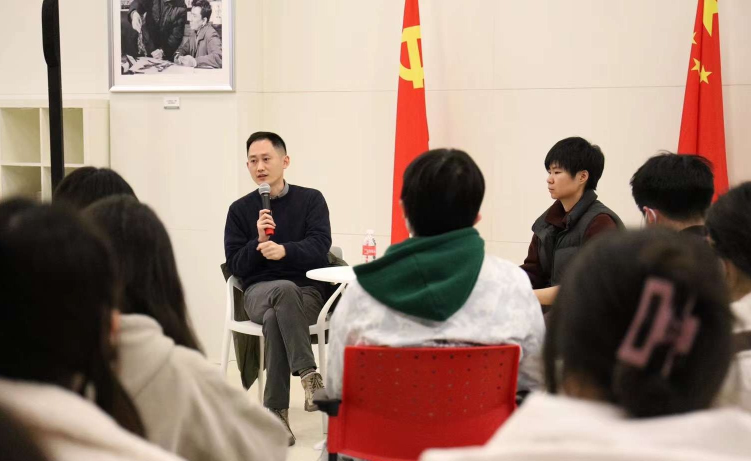当天下午,支队前往上海电影博物馆参观,并围绕上影集团发展历程展开座谈。上海电影博物馆馆长助理、策展总监王腾飞与三位青年制作人邱慧、张宁恬、黄飞龙参与活动。交流中,同学们充分体会到电影人扎根生活土壤的创作理念和主动创新应变的创作态度。