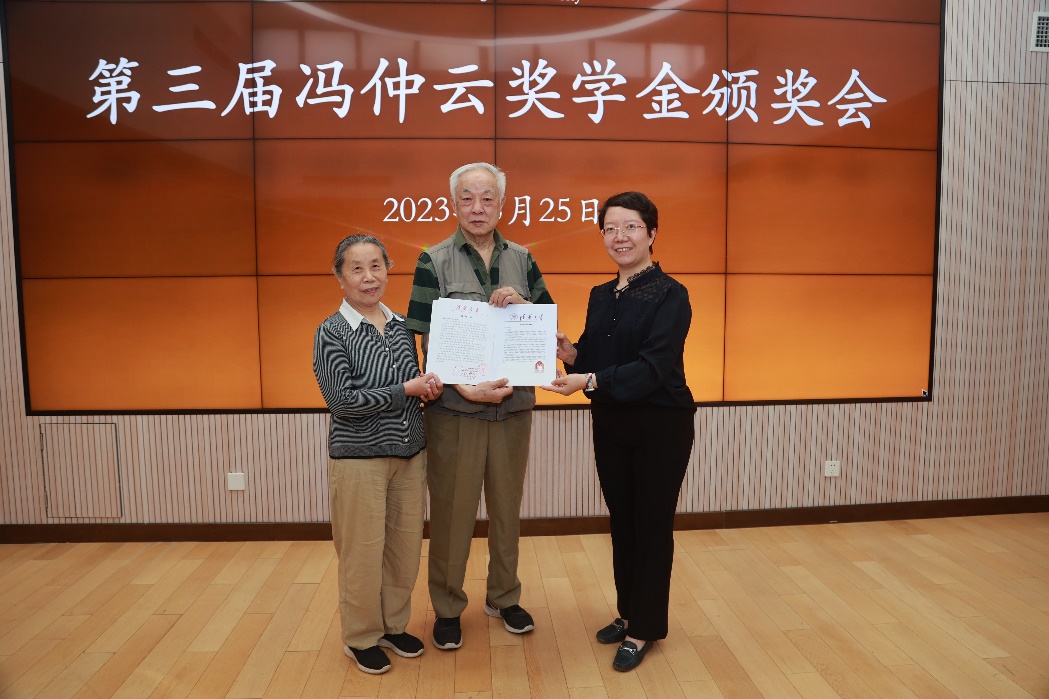 党委研工部副部长李沛雨宣布表彰决定和第三届冯仲云奖学金获奖名单。经三个相关院系评选,12名优秀学生工作者获得奖励。韩景阳向获奖者颁发获奖证书。冯松光及夫人何晓旋向获奖者赠送《冯仲云传》。