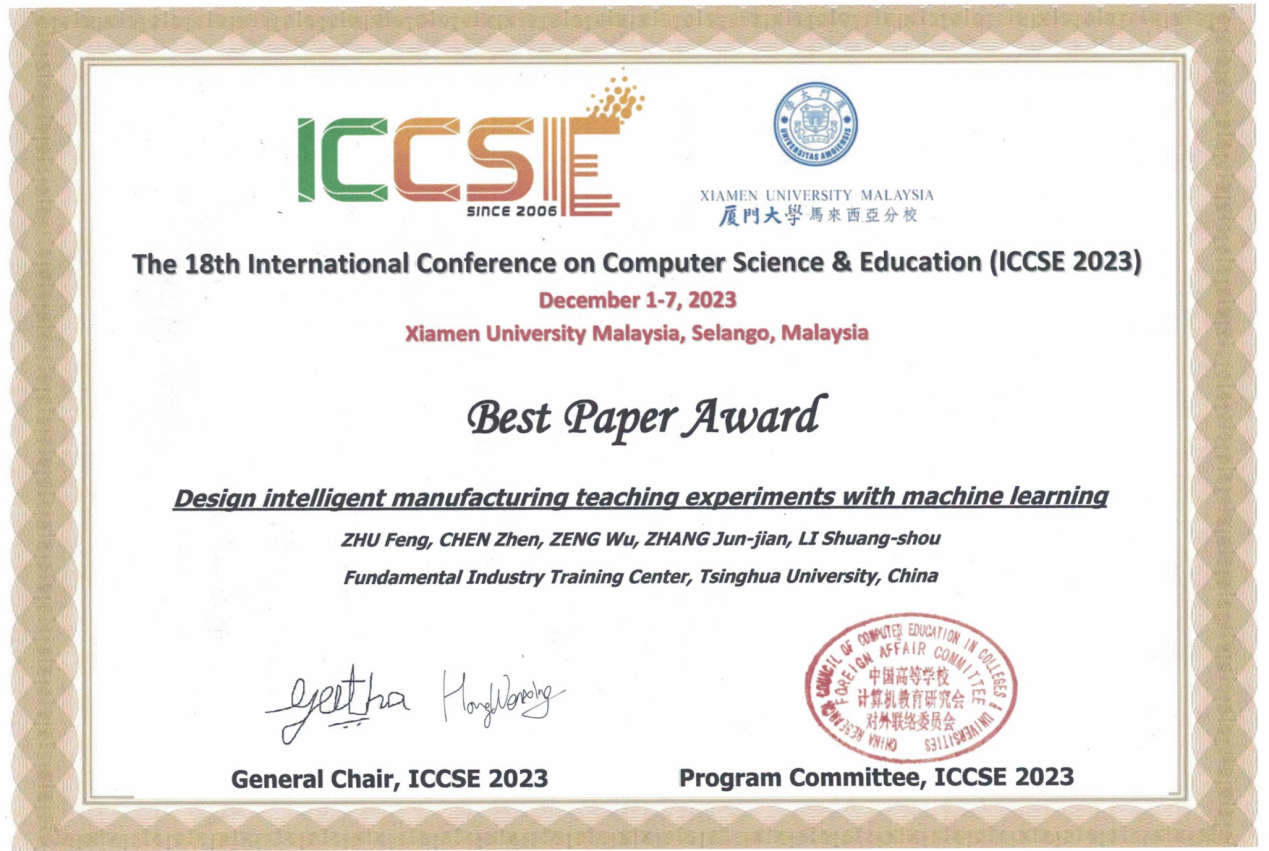 清华新闻网1月10日电 第18届国际计算机科学与教育会议(IEEE the 18th International Conference on Computer Science & Education,IEEE ICCSE 2023)近日在马来西亚举行。91精品国产自产在线老师啪-国产一级农村无码-中文字幕无码人妻AAA片-人妻不敢呻吟被中出A片视频-好看的亚洲av日韩av在线播放基础工业训练中心教师朱峰、陈震组成跨学科交叉团队,在基础工业训练中心主任李双寿的指导下,基于实践教学研究形成的论文“使用机器学习设计智能制造教学实验”(Design Intelligent Manufacturing Teaching Experiments with Machine Learning)获得最佳论文奖(Best Paper Award)。