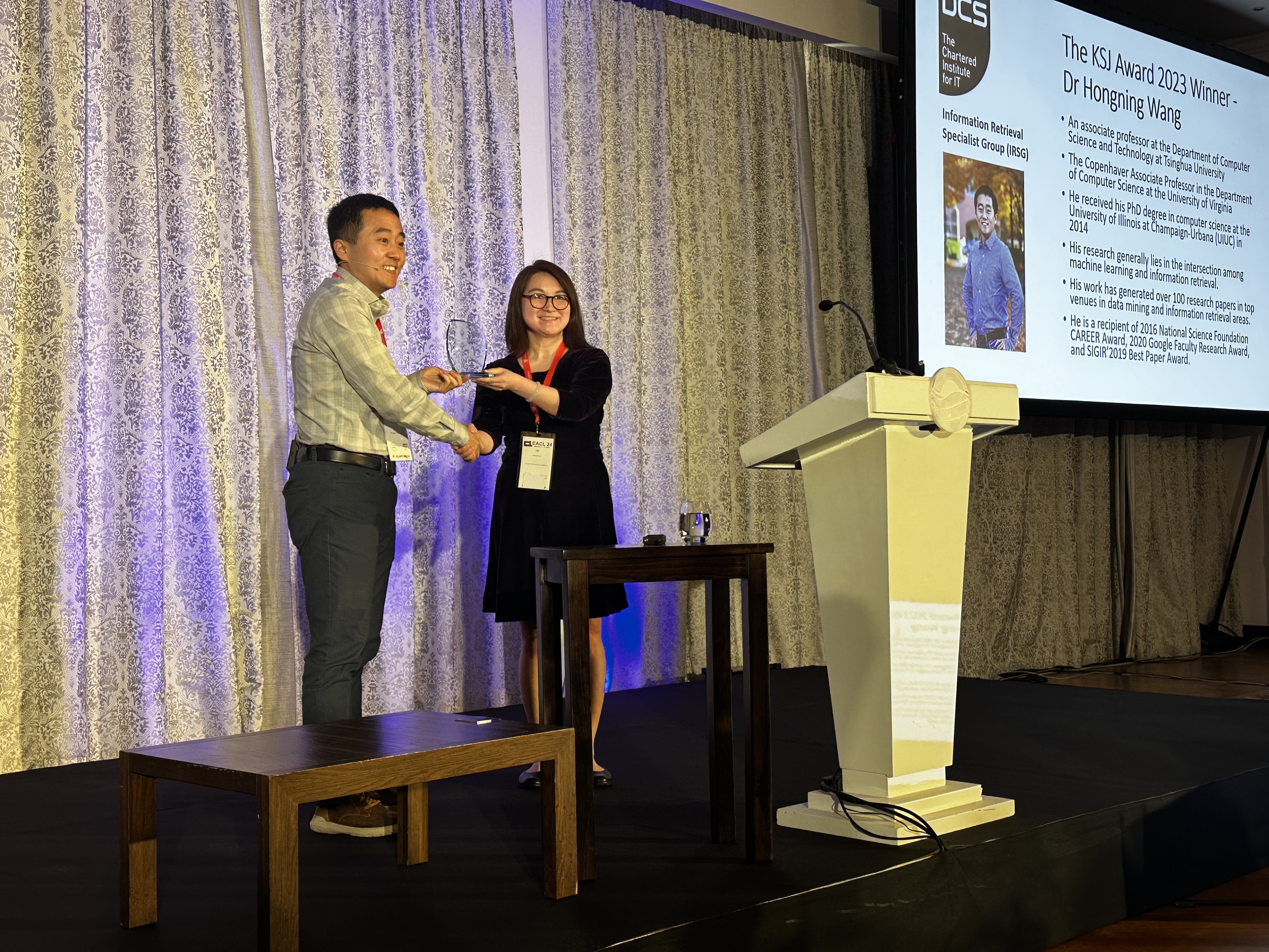 卡伦·斯帕克·琼斯成就奖是英国计算机学会(British Computer Society,BCS)为纪念信息检索领域先驱卡伦·斯帕克·琼斯(Karen Spärck Jones)教授而设置,每年在全球信息检索与自然语言处理领域内遴选候选人,并最终评审出唯一一名获奖者。王宏宁以其在个性化信息检索、基于博弈论的信息检索系统优化方法中的研究和贡献成为2023年该奖获得者。