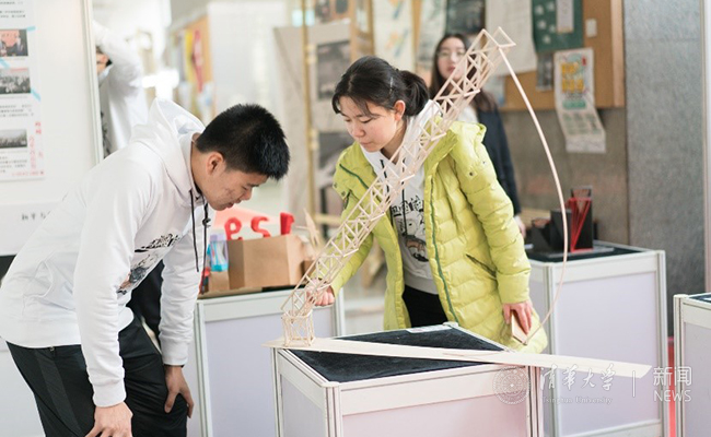 观展的同学仔细研究土木系结72班集体创作结构设计作品“断桥与脊梁”