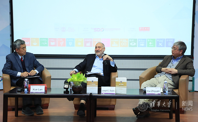 现场交流,从左至右依次为:薛澜、约瑟夫·斯蒂格利茨、崔之元