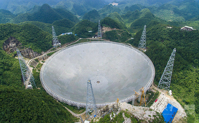 500米口径球面射电望远镜位于贵州省黔南平塘县大窝凼的喀斯特洼坑中,被誉为“中国天眼”。该项目由我国天文学家于1994年提出构想,2011年3月正式开工建设,2016年9月25日正式落成启用,前后历时共22年。500米口径球面射电望远镜由主动反射面系统、馈源支撑系统、测量与控制系统、接收机与终端及观测基地等几大部分构成,是具有我国自主知识产权、世界最大单口径、最灵敏的射电望远镜。借助这只巨大的“天眼”,科研人员可以窥探星际之间互动的信息,观测脉冲星,探索宇宙之源,甚至搜寻可能存在的星外文明。