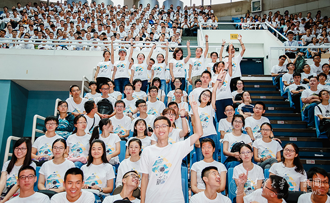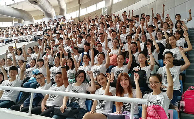 新同学在亲友、师长的陪同下走进综合体育馆。