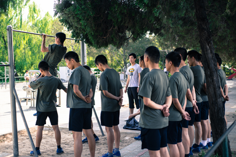 每天早上的晨练内容都不尽相同。除了以长跑为主体能训练外,有的时候是队列训练。站军姿、摆臂、踢腿。飞班特有的空军蓝色制服在早晨柔和的阳光中看上去格外庄严肃穆。