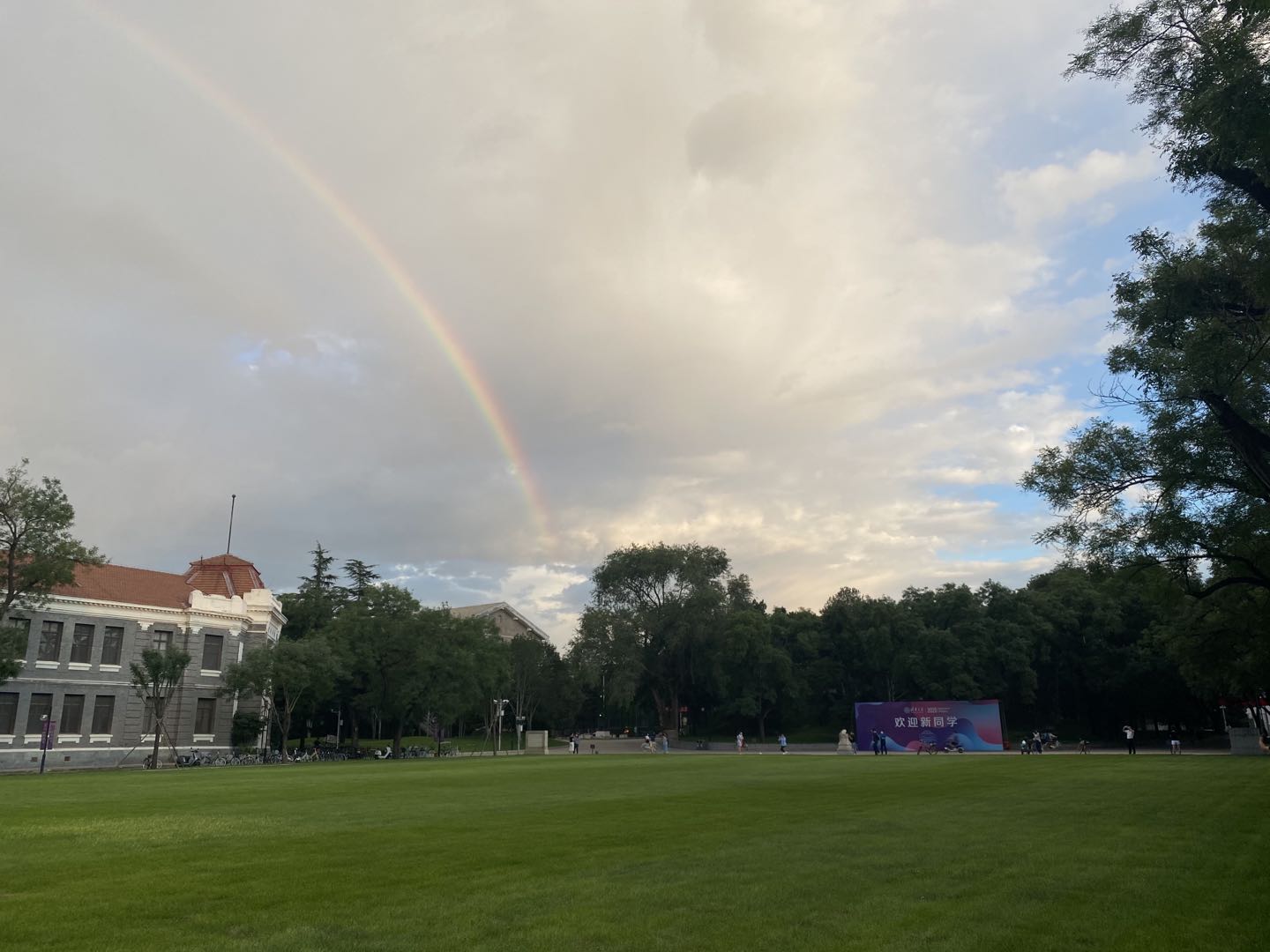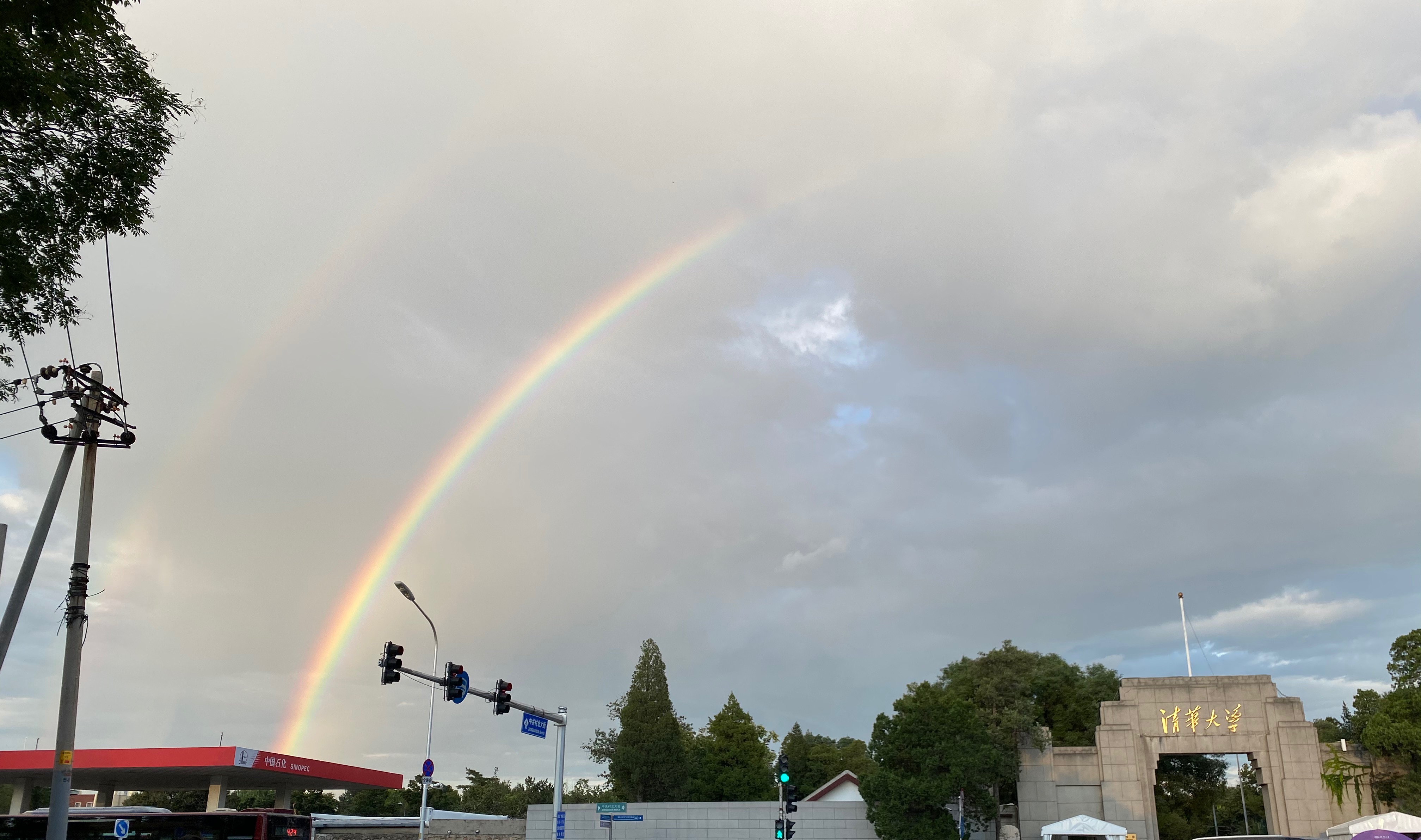 短短的一场秋雨后,一轮彩虹豁然出现在清华园上空。绚丽的彩虹和明媚的晚霞同时出现,吸引了不少师生用镜头留下难得的美景。