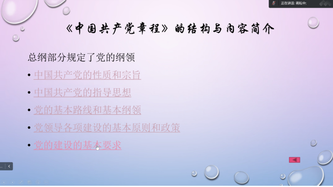 蒋耘中以“党内行为规范的根本遵循”为题,系统全面地阐述了《中国共产党章程》的重要地位、整体结构和主要内容,并讲解了党的二十大对《中国共产党章程》作出的修改。蒋耘中提到,我国的人口规模超过现有发达国家人口的总和,迈进现代化社会的艰巨性和复杂性前所未有,发展途径和推进方式也必然具有自己的特点,党和国家始终是从国情出发来想问题、作决策、办事情。蒋耘中以近年来我国发展情况为依据,阐明《中国共产党章程》随时代变化的重要意义和时代价值,并提醒各位学员要共同维护《中国共产党章程》的权威性和严肃性,在不断学习的过程中真正把《中国共产党章程》作为加强党性修养的根本标准。