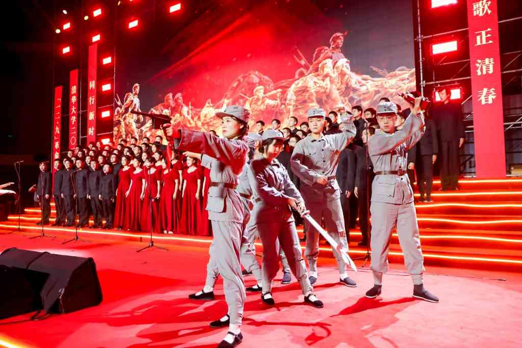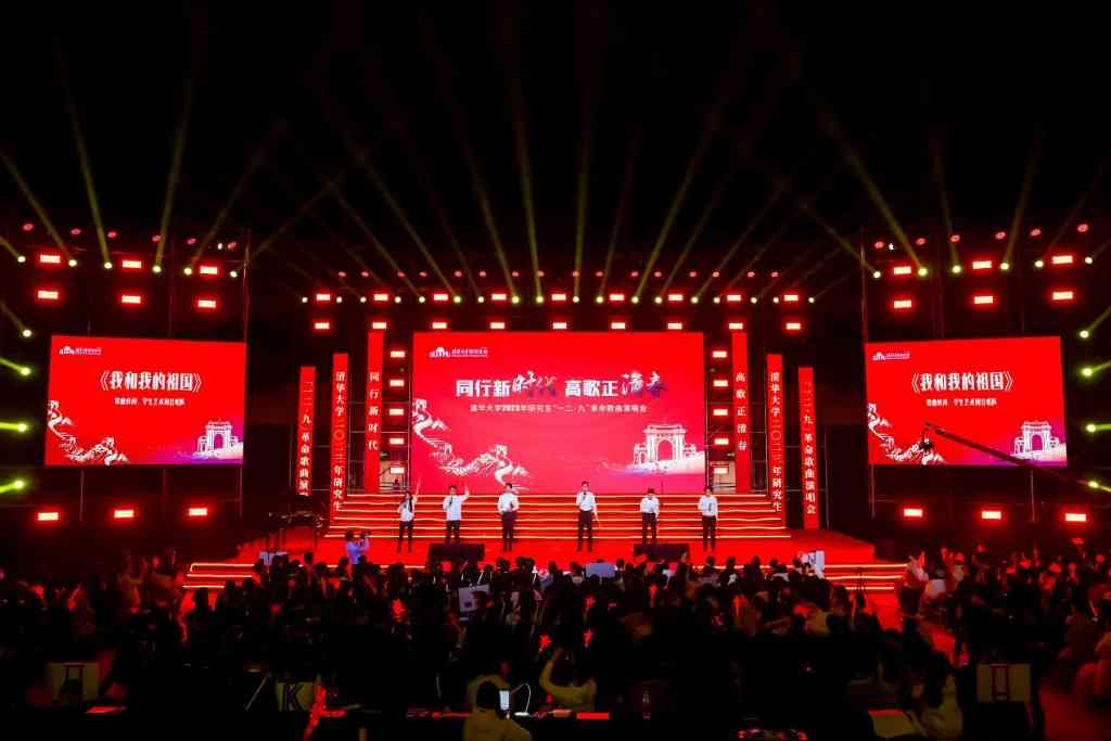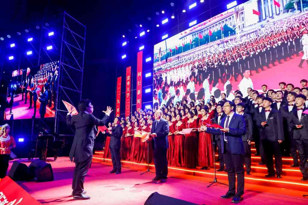 合唱快闪《我和我的祖国》引起来现场观众的阵阵掌声,学生代表为观众带来朗诵节目《多彩清春,时代有我》,展现当代清华人的风采。各联队指挥共同合唱《领航》,将晚会气氛推向高潮。