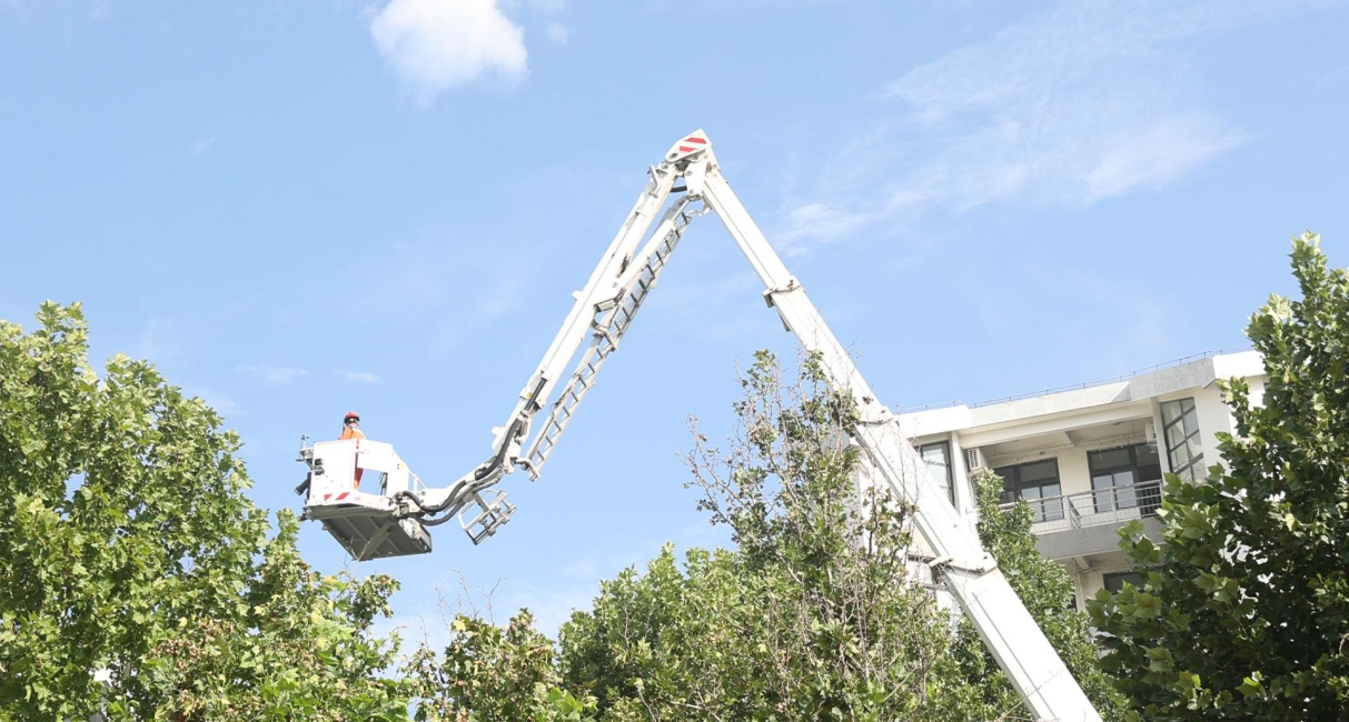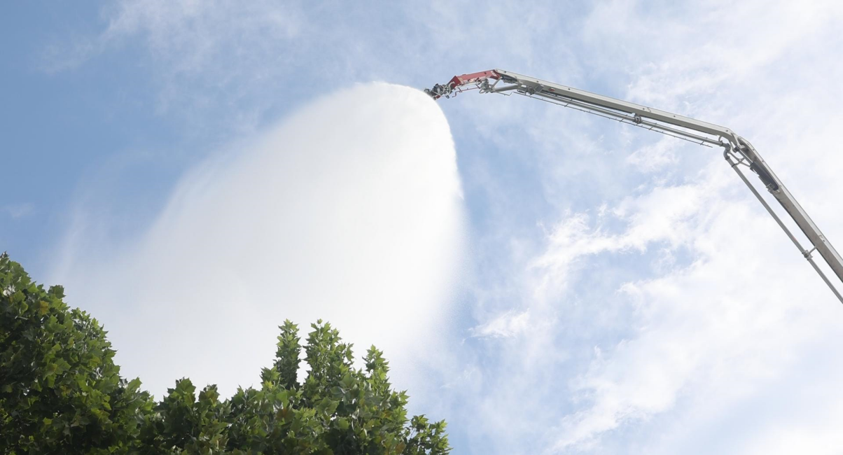 本科生新生志愿者现场演练床单结绳、缓降器缓降自救等项目,海淀区消防救援支队开展高空云梯车救人、消防高喷车出水灭火等科目演练。