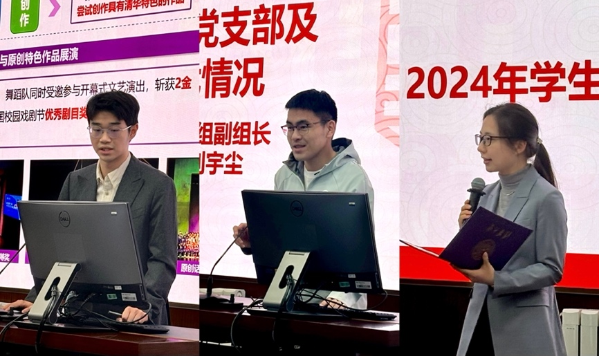 学生艺术团团长刘恺东从组织架构、集中班制度及活动开展等方面全面介绍了学生艺术团的整体情况。工作组副组长刘宇尘介绍了党支部建设及评奖评优工作。团工委书记乔向荃讲解了学生艺术团多层次、长周期、全方位的骨干培养体系。
