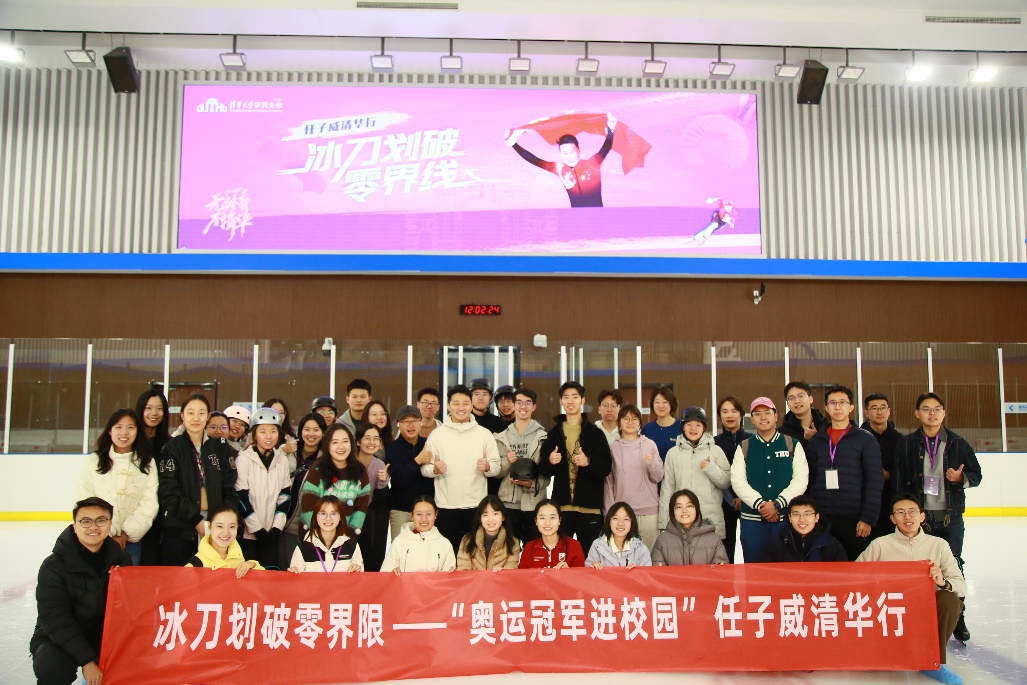 11月14日上午,北京冬奥会短道速滑男子1000米冠军、男女2000米混合接力冠军任子威走进清华园,结合自身成长经历诠释中国短道速滑队“坚持、拼搏、团魂、信念、传承”的精神内核,并解答了同学们关于坚持训练、克服伤痛等方面的问题。在北体育馆冰场,任子威进行示范教学,逐一指导、点评同学们的滑冰动作。