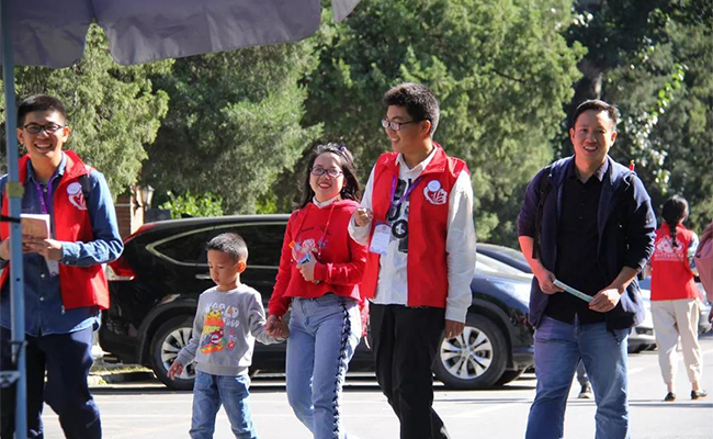 除了固定志愿服务站的志愿者,还有更多的志愿者带着游客穿梭在二校门、清华学堂、大礼堂等清华景点之间,为游客讲解清华的历史与风物。